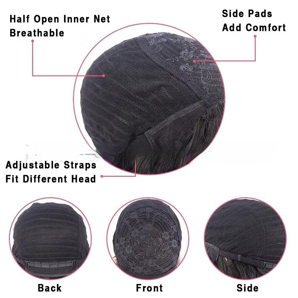 Crafted from 100% human hair, this wig can be styled, straightened, or curled just like your own hair. The full-mechanism cap ensures durability and structure while maintaining lightweight comfort for all-day wear. The adjustable straps inside the cap provide a secure and personalized fit, and the breathable design allows airflow to keep your scalp cool and comfortable. The natural black tone complements any skin color, offering effortless elegance and versatility.